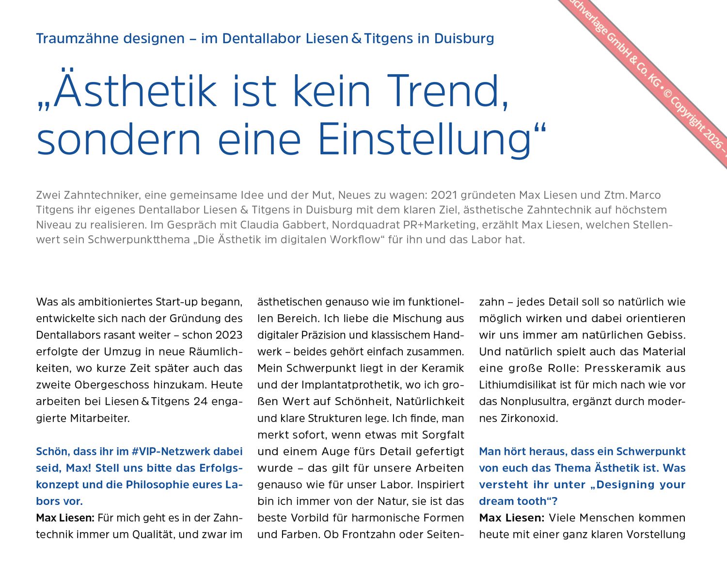 Zwei Zahntechniker, eine gemeinsame Idee und der Mut, Neues zu wagen: 2021 gründeten Max Liesen und Ztm. Marco Titgens ihr eigenes Dentallabor Liesen & Titgens in Duisburg mit dem klaren Ziel, ästhetische Zahntechnik auf höchstem Niveau zu realisieren. Im Gespräch mit Claudia Gabbert, Nordquadrat PR+Marketing, erzählt Max Liesen, welchen Stellenwert sein Schwerpunktthema „Die Ästhetik im digitalen Workflow“ für ihn und das Labor hat.