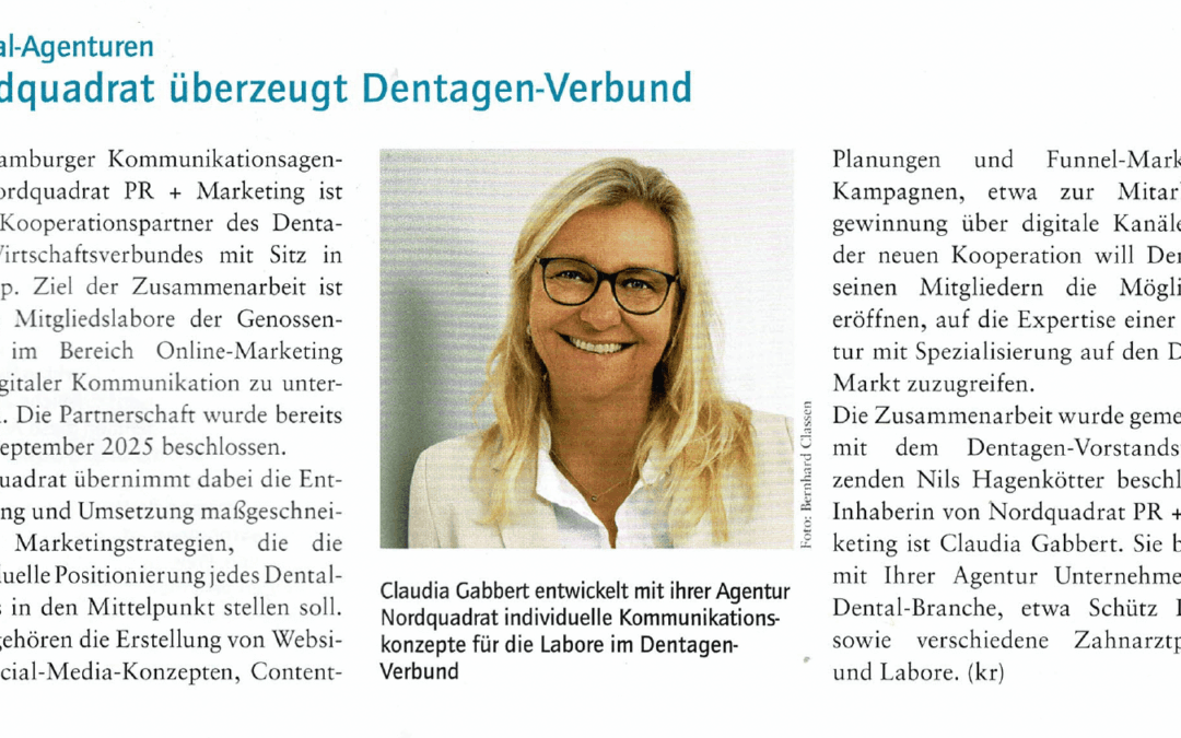 Die Hamburger Kommunikationsagentur Nordquadrat PR + Marketing ist neuer Kooperationspartner des Dentagen Wirtschaftsverbundes mit Sitz in Waltrop. Erschienen in „ Dental Marketing“ Ausgabe...